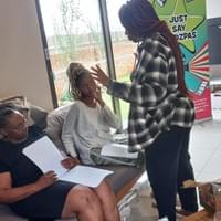 Oversight Committee member Jacqui Hlongwane presents R3 000 cheques to two outstanding young achievers — one honoured with the Oscarina Award for film excellence, and the other with the Kiddzpas Award for embodying teamwork and creative leadership
